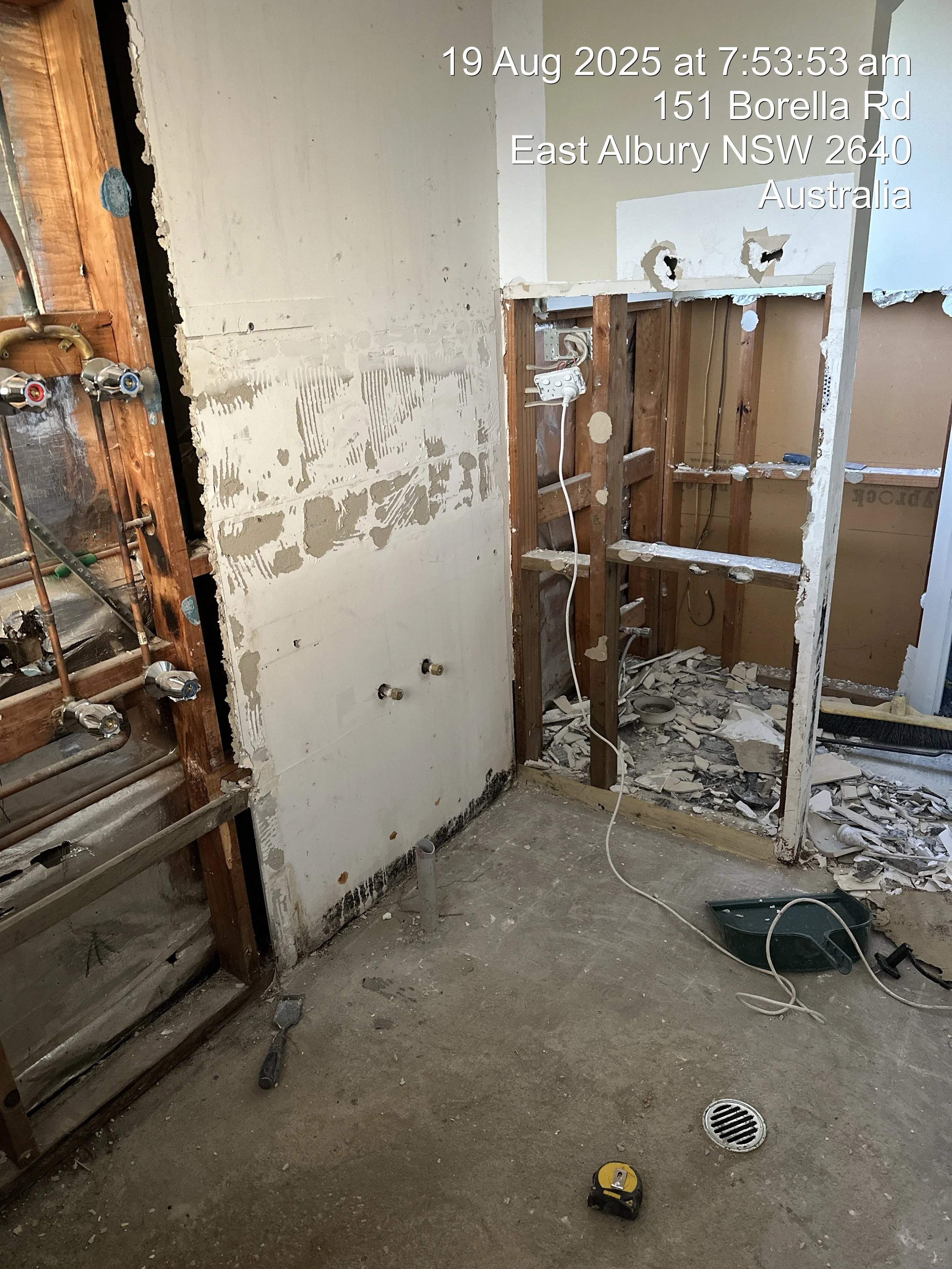 All floor tiles were taken up and the levels reset to ensure proper falls to the existing waste. Once the spa was removed, a new shower recess was created by directing floor falls to the former spa waste. Two puddle flanges were installed for added protection, and all walls and floors in the affected areas were waterproofed to Australian standards.